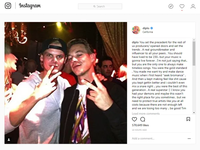 “Kamu (Avicii) sudah menjadi patokan untuk banyak produser seperti kami, membuka pintu dan membuat sebuah tren,” tulis Diplo di awal postingannya. “Seharusnya kamu hidup sampai 150, tetapi musikmu mulai selalu hidup selamanya. Bukan hanya itu saja, tetapi kamu adalah satu-satunya orang yg terus membuat lagu-lagu yg tidak termakan oleh zaman,” lanjut Diplo.