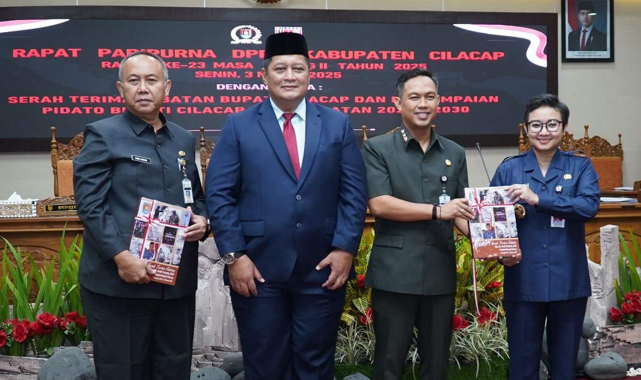 Usai sah dilantik Presiden RI Prabowo Subianto pada Kamis (20/02/2025) lalu, DPRD Kabupaten Cilacap menggelar Rapat Paripurna Serah Terima Jabatan (Sertijab) dari M. Arief Irwanto selaku Pj. Bupati Cilacap 2024-2025 kepada Bupati dan Wakil Bupati Cilacap 2025-2030, Syamsul Auliya Rachman dan Ammy Amalia Fatma Surya. Acara yang dilanjutkan dengan Penyampaian Pidato Perdana Bupati Cilacap tersebut digelar di Ruang Rapat Paripurna DPRD Cilacap pada Senin (03/03/2025).