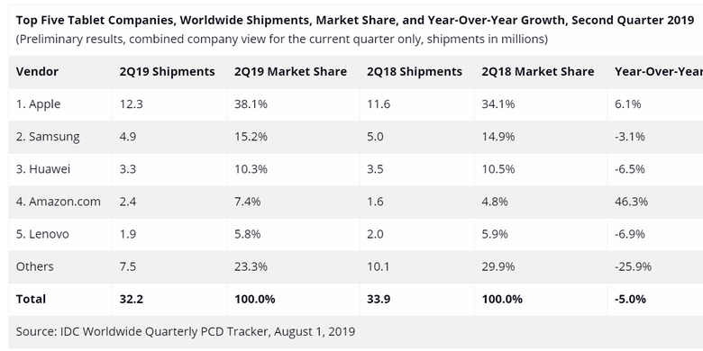 Menurut laporan IDC, secara keseluruhan ada sekitar 32,2 juta tablet yg dikapalkan ke pasar global pada Q2 2019. Dari jumlah ini, sebanyak 12,3 juta yaitu produk iPad.