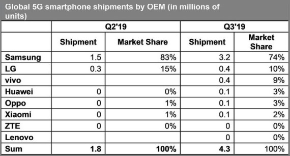 Selama Q3 2019 ada sebanyak 4,3 juta smartphone 5G yg didistribusikan oleh para vendor ponsel pintar. Angka pengapalan ini meningkat lebih dari 100 persen dari kuartal sebelumnya.