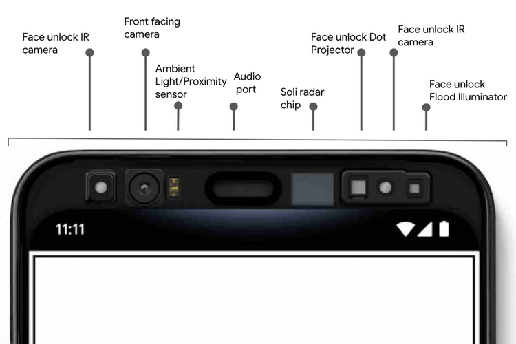 Dengan tambahan beberapa fitur di atas, bagian bingkai atas layar Pixel 4 pun mau tidak mau menjadi tebal karena harus memuat aneka jenis sensor, kamera, proyektor, hingga chip radar Soli.
