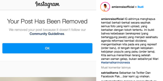 Pihak Amien Rais menuding bahwa apa yg dikerjakan Instagram terkait foto yg diunggah dahulu tiba-tiba dihapus, yaitu wujud ketidakadilan. Kejadian itu tidak cuma sekali beberapa kali, namun berkali-kali pihak Instagram menghapus foto-foto pihaknya.