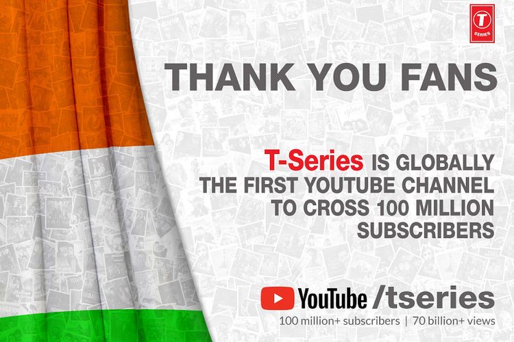 “Kanal YouTube terbesar, T-Series sudah melampaui capaian YouTube lainnya dengan menjadi satu-satunya (kanal) yg memiliki #100MillionSubscriber. Terima kasih sudah menjadi bagian dari perjalanan ini. T-Series membuat India bangga,” ujar pengelola kanal itu.